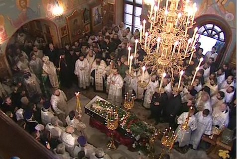 Beyaz elbiseleriyle yüzden fazla ruhban, ellerinde yanan mumlarla pederin naaşının etrafında yer alır. Beyazların arasında, siyah yas elbiseleri ile ailesi bulunur. Cenaze merasimi sonrası Patrik Kiril hazretleri kısa bir konuşma yapar. Üç saat sonra cenaze Kuntsevo mezarlığına doğru yola çıkar ve Moskova, Kuntsevo Kutsal mendil mezarlığına defnedilir. Ölümünden 40 gün sonra pederin isim günüdür, Kutsal Peygamber Daniel günü.